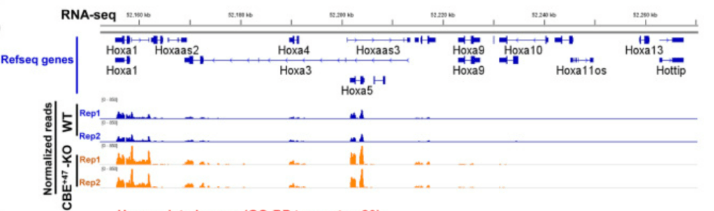 8.1 : C’est une région de la chromatine (flanquée par des isolateurs où se fixent CTCF) où les interactions entre séquences régulatrices de la transcription sont privilégiées. 8.2 : On constate que le nombre de séquences lues en RNAseq et donc le niveau de transcription est globalement augmenté pour tous les gènes du complexe entre Hoxa1 et Hoxa9. La transcription des gènes plus en 5′ dans le complexe reste éteinte. La frontière de TAD qui a été ôtée chez le mutant est en 3′ du complexe donc du côté des gènes dont la transcription a été stimulée. On peut penser que leur transcription chez le mutant est tombée sous l’influence d’un enhancer qui se trouve habituellement dans un autre TAD et qui n’agit pas sur eux dans les cellules sauvages.