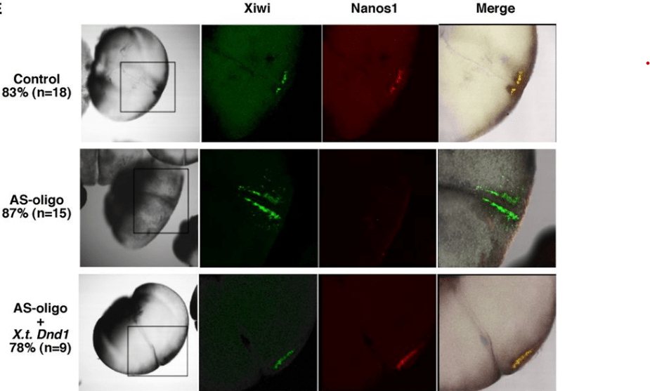 10.1 : La structure secondaire de l’ARNm de nanos1 provoquée par la séquence TCE juste en arrière du codon d’initiation pourrait empêcher la progression des ribosomes. 10.2 : En absence de TCE, l’ARNm de nanos1 est bien traduit en protéine mais celle-ci est plus courte que la protéine normale car il manque la séquence correspondante au TCE (qui est en 3′ de l’AUG d’initiation donc dans la séquence codante traduite). En présence de dnd1, vasa et deadSouth, on détecte la protéine Nanos1 montrant que ces protéines sont nécessaires pour permettre la traduction des ARNm de nanos1 qui possèdent leur TCE. Il y a un très léger effet aussi en présence de centroid. 10.3 : Dans les embryons contrôle, on observe une co-localisation entre Xiwi et Nanos1 indiquant que Nanos1 est localisée dans le plasme germinal. En absence de Dnd1, le plasme germinal est toujours présent (mais différemment localisé) comme l’atteste l’expression de Xiwi mais on ne détecte plus Dnd1. Le sauvetage de ces embryons par une protéine Dnd1 restaure partiellement la bonne localisation du plasme germinal. On déduit de ces expériences que Dnd1 est nécessaire pour la production de la protéine Nanos1 et que celle-ci est nécessaire à la bonne localisation du plasme germinal.