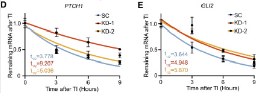 12.1 : Il s’agit de vérifier la spécificité de l’action de CRISPR-Cas9 et de voir si on obtient le même phénotype avec deux cibles indépendantes sur le même gène. Si ce n’est pas le cas, ça veut dire qu’il y a eu dans un des cas une édition du génome ailleurs que dans METTL3, ce qui a pu influencer le phénotype. 12.2 : La protéine de ménage GAPDH est à peu près pareillement exprimée dans le cas SC et KD-2 et moins dans KD-1 ce qui rend les conclusions moins faciles pour KD-1. Néanmoins, on observe une nette diminution de l’expression de METTL3 par l’action de CRISPR-Cas9 dans les deux cas où le gène est ciblé. Cependant, un peu de METTL3 est toujours présent : soit CRISPR-Cas9 n’a pas pu agir correctement dans toutes les cellules de la population dont on a extrait les protéines, soit il s’agit du METTL3 produit avant l’action de CRISPR-Cas9 et qui n’a pas encore été entièrement dégradé. 12.3 : L’expression de la protéine PTCH1 augmente lorsque la quantité de METTL3 est diminuée tandis que c’est l’inverse pour GLI2. METTL3 inhibe donc l’expression de PTCH1 (soit au niveau de la transcription, soit au niveau de la traduction) et METTL3 active l’expression de GLI2 (là aussi au niveau de la transcription ou de la traduction). Alternativement, METTL3 peut influencer la stabilité de ces protéines. 12.4 : L’inhibition de la transcription permet de suivre la survie des ARNm qui ont été produits avant. Pour les ARNm de PTCH1 on constate que la diminution de l’expression de METTL3 a plutôt un effet stabilisant (avec un effet plus fort de KD-1 relativement à KD-2). On observe la même chose avec les ARNm de GLI2 avec cette fois-ci un effet similaire entre KD-1 et KD-2. On en déduit que METTL3 a un effet déstabilisant sur les ARNm de ces deux gènes, stimulant sans doute leur dégradation. 12.5 : La stabilisation des ARNm de PTCH1 lorsque METTL3 est moins présent peut expliquer l’augmentation de la quantité de protéine PTCH1 observé en western-blot (cependant on ne retrouve pas l’effet différentiel de KD-1 et de KD-2 sur le western-blot). En revanche, pour GLI2 la stabilisation des ARNm va à l’encontre de la chute importante de la quantité de protéine. D’autres mécanismes que la stabilisation des ARNm doivent être à l’oeuvre au niveau transcriptionnel ou traductionnel.