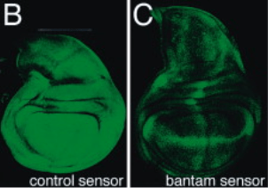 *14.2 En analysant l’expression de la GFP dans le disque imaginal de l’aile dans les deux drosophiles transgéniques, que peut-on déduire de l’expression et de l’activité de Bantam ?