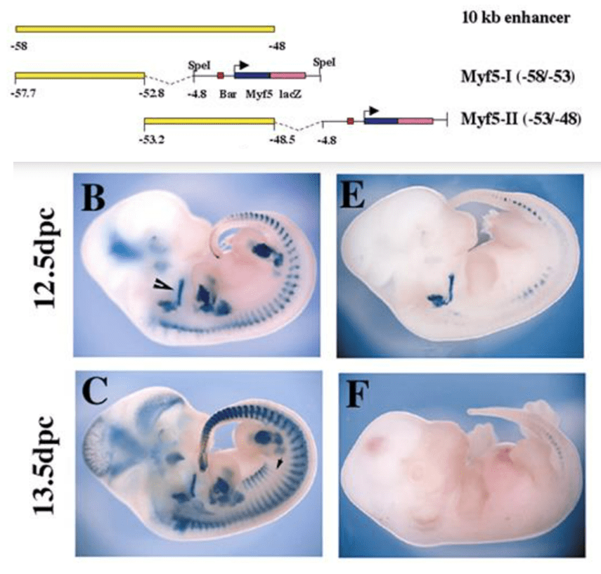 3.1 : Il faut veiller à ce que la séquence codant la beta-galactosidase soit dans le même cadre de lecture que la séquence codant Myf5 pour que la traduction puisse ajouter les bons acides aminés en lisant les bons codons. 3.2 : On observe une expression segmentée typique des somites et on observe aussi une expression dans des masses cellulaires dans les bourgeons de membre. Il y a aussi une expression céphalique, notamment dans le futur muscle hypoglosse. Cela correspond bien à ce que l’on connait de l’expression de Myf5 qui est exprimé dans le dermomyotome (des somites), dans les myoblastes en migration vers les bourgeons de membre et dans de futures masses musculaires céphaliques. 3.3 : On voit clairement l’expression dans les somites se scinder en deux dans la région troncale (petite flèche noire). Cela correspond à la division en région épaxiale et hypaxiale. L’expression s’étend aussi dans la tête, pas tellement dans les bourgeons de membre. 3.4 : A 12,5 dpc, l’expression du gène rapporteur est réduite à quelques somites, et dans chacun de ces somites, l’expression est moins étendue. Il est exprimé dans le futur muscle hypoglosse. A 13,5 dpc, cette expression disparaît quasiment complètement (expression résiduelle dans une partie des somites de la queue). Le fragment d’enhancer Myf-5-I contient l’essentiel des séquences régulatrices de Myf5 tandis que le fragment Myf-5-II ne contient que des séquences régulatrices de renforcement dans des régions bien définies (une partie des somites, futur muscle hypoglosse) et à un moment bien défini (à 12,5 dpc et plus à 13,5 dpc).