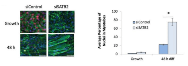 4.1 : Lors de la phase de prolifération, on observe une forte présence de la forme entière de SATB2 (entre 75 et 100 kDa) et une faible présence d’une forme clivée qui contient l’épitope C-terminal (il y a peut-être l’autre partie de la protéine qui est présente dans les extraits mais l’anticorps utilisé ne peut pas la reconnaître). Au fur et à mesure de la différenciation, la forme entière est de moins en moins abondante et la forme clivée est de plus en plus abondante. On peut proposer que lors de la différenciation la protéine STAB2 est clivée. On ne peut pas savoir si cela la rend plus active ou moins active. 4.2 : Il s’agit de vérifier que le siARN introduit a bien fonctionné et a inhibé la production de la protéine SATB2, ce qui est le cas. 4.3 : En condition de prolifération, on constate que les cellules sans SATB2 sont plus marquées par la desmine et plus allongées. Après 48h de mise en culture dans des conditions de différenciation, cet effet est encore plus visible, indiquant une différenciation précoce des cellules C2C12. Cela est confirmé par la présence d’un nombre moyen de noyaux dans les myotubes nettement supérieur en absence de SATB2, indiquant des fusions cellulaires plus importantes. SATB2 joue donc un rôle de frein à la différenciation des myoblastes. Le clivage observé lors de la différenciation doit probablement inactiver la protéine.