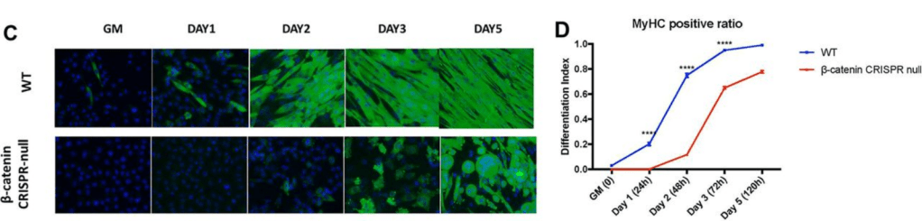 5.1 : Dans les myoblastes sauvages, l’expression de MyHC devient visible dès le premier jour de culture dans le milieu de différenciation puis devient de plus en plus étendue. On observe que les cellules prennent une forme allongée et se différencient en myofibres. En absence de béta-caténine, l’expression de myHC est très retardée (très peu d’expression au jour 2, activation plus marquée au jour 3) et la majorité des cellules ne prend pas une forme allongée. 5.2 : La béta-caténine est impliquée dans deux processus : l’adhésion cellule-cellule lorsqu’elle est dans le complexe reliant les cadhérines aux microfilaments d’actine et la voie de signalisation Wnt. On ne peut pas savoir avec ces expériences laquelle de ces deux fonctions est impliquée dans ce qui est observé. Si c’est la fonction de béta-caténine dans la voie de signalisation Wnt qui est impliqué, le milieu de différenciation utilisé en culture doit contenir des ligands Wnt. 5.3 : Il s’agit d’une expérience de sauvetage. La réexpression de la beta-caténine sauvage permet de sauver la différenciation en myofibres contrairement à un vecteur vide montrant la spécificité de la mutation de la beta-caténine endogène réalisée par CRISPR-Cas9. La forme de la beta-caténine incapable de s’associer dans le complexe cadhérine/caténine/microfilaments d’actine n’est pas capable de sauver la différenciation tandis que la forme de la béta-caténine incapable de s’associer à TCF (et donc incapable d’être partie prenante dans la voie de signalisation Wnt) est capable de sauver la différenciation. Cela veut dire que la fonction pertinente de la beta-caténine dans ce contexte n’est pas sa participation à la voie de signalisation Wnt mais liée à son action dans les complexes d’adhérences cellule-cellule.
