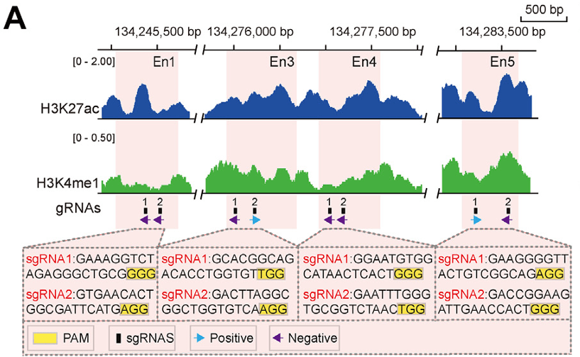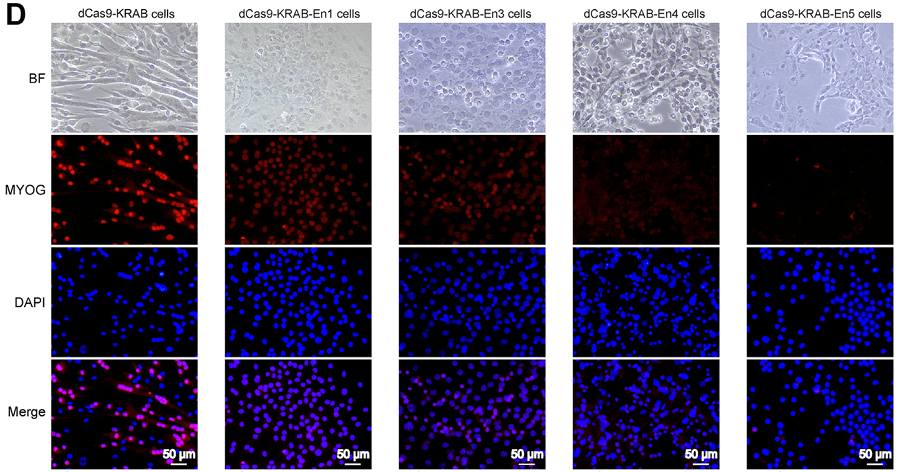 6.1 : Le ChIPseq nous indique que des marques épigénétiques activatrices de la transcription sont présentes dans les régions correspondant aux enhancers potentiels, ce qui correspond bien à leur fonction. On ne peut cependant en conclure que ces enhancers régulent vraiment l’expression du gène codant la myogénine à ce stade de l’analyse. 6.2 : Contrairement au contrôle (première colonne) où les cellules expriment fortement myogénine et forment des myotubes, l’orientation d’un inhibiteur de la transcription vers chacun des enhancers inhibe l’expression de la myogénine (forte diminution pour une inhibition de En1 et En3 et disparition quasi-complète pour En4 et En5) et empêche les cellules de former des myotubes. Par conséquent, chacun des enhancers putatifs est nécessaire pour une bonne expression de la myogénine (En4 et En5 étant absolument indispensables pour avoir au moins un peu d’expression).