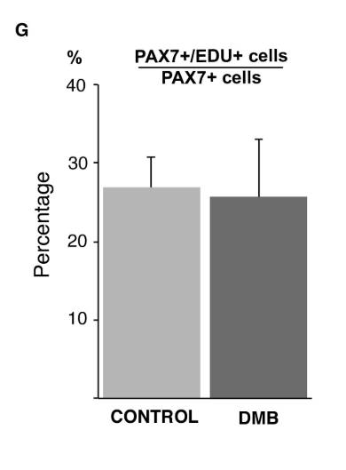 7.1 L’absence de contraction musculaire entraine une baisse du nombre de cellules marquées Pax7 donc des progéniteurs musculaires. Les masses de cellules différenciées MF20+ paraissent généralement plus petites en présence de DMB (pour les 3 masses du haut, celle du bas est plus grande). Il semble donc que les contractions musculaires soient nécessaires au maintien d’un nombre normal de progéniteurs musculaires au cours de l’organogenèse et que cela peut affecter par la suite la taille des muscles. Cela peut passer par un contrôle de la prolifération, de la survie ou de la différenciation (les progéniteurs se différencieraient trop tôt et perdraient trop vite l’expression de Pax7). On ne peut exclure cependant un effet toxique du DMB sur les progéniteurs musculaires et aussi les muscles différenciés. 7.2 Au sein des cellules Pax7+ qui restent en cas de paralysie musculaire, la prolifération reste au même niveau que dans les embryons normaux. Cela veut dire que l’absence de contractions musculaires n’affecte pas la prolifération des précurseurs musculaires, ce qui invalide l’une des hypothèses dans la réponse à la question précédente.