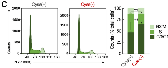 Beaucoup de cellules tumorales sont très dépendantes de l’apport extérieur de cystéine. On cultive pendant 24h des cellules d’hépatocarcinomes de souris dans un milieu supplémenté en cystéine (Cyss(+)) ou dans un milieu appauvri en cystéine (Cyss(-)). On analyse par cytométrie en flux la fluorescence de l’iodure de propidium. Source : https://www.jbc.org/article/S0021-9258(24)02392-5/fulltext
