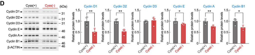 On réalise quatre expériences indépendantes comme précédemment et on extrait les protéines que l’on soumet à une analyse western-blot avec les anticorps indiqués. Les graphiques présentent les résultats de la quantification en normalisant par rapport aux cultures en milieu supplémenté en cystéine.