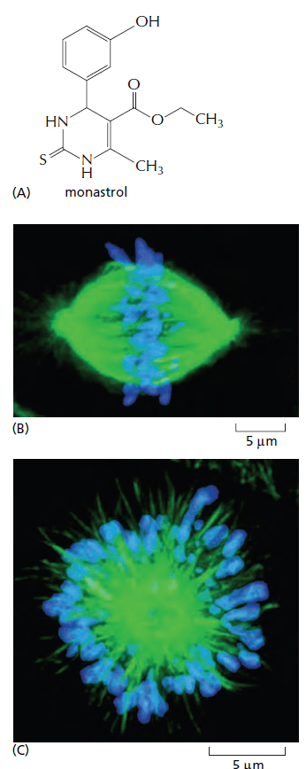 6.1 Les kinésines sont des moteurs moléculaires qui peuvent transporter des complexes moléculaires, des vésicules ou des organites vers le pôle positif des microtubules. 6.2 La cellules observée en B est en métaphase de mitose. En présence de monastrol, la plaque métaphasique est complètement désorganisée. Les microtubules, au lieu de rayonner à partir des deux extrémités de la cellule, rayonnent à partir du centre ce qui indique que des kinésines sont impliquées dans la mise en place du fuseau mitotique et probablement dans la séparation des paires de centrosomes qui contrôlent l’organisation des microtubules.
