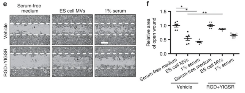 1.1 Le test de cicatrisation liée à la blessure de tapis cellulaire consiste à arracher les cellules de manière contrôlée sur une trajectoire précise dans une boîte de Pétri et d’observer à intervalles réguliers/filmer la manière dont les cellules avoisinantes de la “blessure” vont coloniser l’espace vide. La principale composante de la cicatrisation de la blessure sera la migration cellulaire mais il peut y avoir aussi une composante liée à la prolifération. 1.2 La séquence RGD est la séquence sur un certain nombre de molécules de la MEC et notamment la fibronectine sur laquelle se fixent les intégrines. Il s’agit de savoir si le comportement des cellules observé ici dépend d’une interaction RGD-intégrine (et donc probablement fibronectine-intégrine). 1.3 Les microvésicules des cellules ES augmentent la rapidité de la cicatrisation suggérant qu’ils stimulent la migration cellulaire. Ils ont un effet similaire à l’ajout de 1% de sérum dans le milieu. Le mélange de peptides RGD et YIGSR ralentit la cicatrisation provoquée par les microvésicules. On en déduit que les interactions des intégrines des trophoblastes avec la MEC sont probablement augmentées par les microvésicules mais comme c’est un mélange qui est utilisé, impossible de savoir si c’est la laminine, la fibronectine ou les deux qui sont les molécules impliquées dans la MEC.