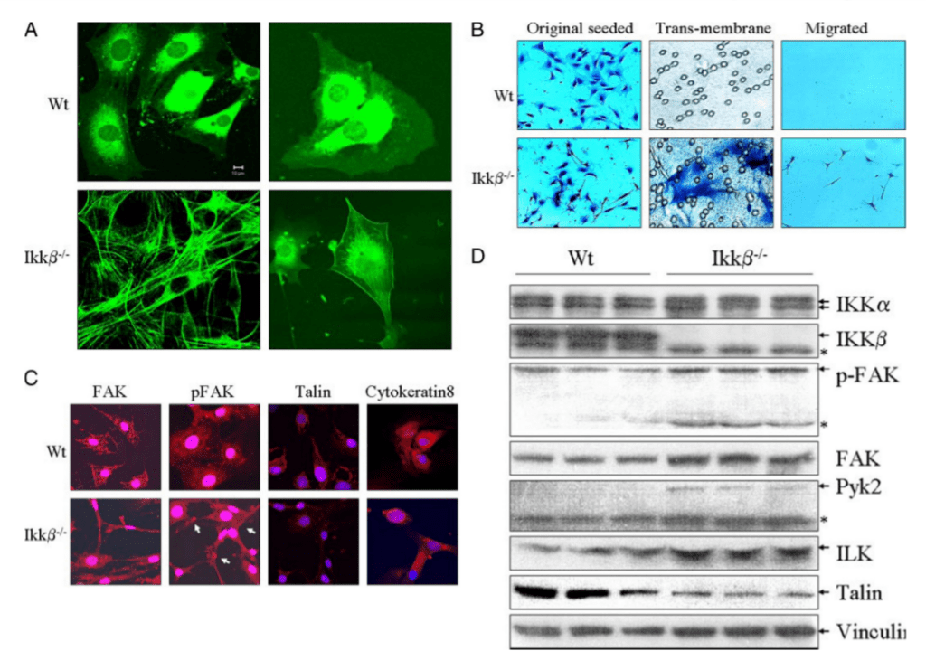 3.1 La phalloïdine couplé à un fluorophore rend visible les microfilaments d’actine. Chez les cellules mutantes, ces microfilaments sont arrangées en fibre de stress ce qui n’est pas le cas chez les cellules sauvages où l’actine forme surtout une masse au centre de la cellule. 3.2 Il s’agit de la création de deux compartiments avec des milieux de composition différente séparés par une membrane poreuse (en général avec des pores d’un diamètre entre 3 et 12 micromètres (à adapter selon les cellules étudiées)). Les cellules sont déposées sur cette membrane et on les incube durant une durée permettant à certaines d’entre elles de traverser la membrane et de se retrouver à sa face inférieure dans le second compartiment. Celui-ci peut par exemple contenir un milieu avec un chémoattractant. 3.3 Le Matrigel est le nom commercial de la matrice de membrane basale solubilisée sécrétée par les cellules de sarcome de souris Engelbreth-Holm-Swarm (EHS). Le Matrigel ressemble à la membrane basale riche en laminine/collagène IV que l’on trouve dans de nombreux tissus et est utilisé par les biologistes cellulaires comme substrat tridimensionnel pour la culture des cellules ou comme ici pour tester les capacités migratoires des cellules. 3.4 Il y a plus de cellules mutantes qui ont traversé la membrane vers la chambre inférieure que de cellules sauvages alors même que l’attachement des cellules à la membrane dans la chambre supérieure était similaire (photos de gauche). On en déduit que les cellules mutants ont des capacités de migration plus importantes que les cellules sauvages. On en déduit que Ikkbeta est un inhibiteur de la migration. 3.5 Le niveau général de FAK et de pFAK est le même dans les deux types de cellules, mais les cellules mutantes présentent des concentrations de pFAK à la périphérie cellulaire qui évoque des points d’adhésion focaux. L’expression de la taline (une protéine souvent associée en complexe avec les intégrines) est plus faible dans les cellules mutantes et on ne voit pas de différence notable pour la cytokératine 8 (un filament intermédiaire). 3.6 On a bien une disparition de la bande spécifique pour les puits correspondants aux extraits protéiques des cellules Ikkbeta-/-. On ne constate pas d’augmentation compensatrice importante de l’expression d’Ikkalpha. La quantité de FAK total est augmentée donc il est difficile de dire si l’augmentation de pFAK est du à ce qu’il y ait plus de FAK total (solution la plus probable) ou si une proportion plus grande de FAK est phosphorylée. Pyk2 et ILK sont être plus exprimées chez le mutant tandis que taline est moins exprimée (ce qui confirme ce que l’on avait vu en immunofluorescence). La vinculine est stable ou faiblement augmentée dans les cellules mutantes par rapport aux cellules sauvages. Les capacités de migration accrue des cellules mutantes provient sans doute de la présence de plus de FAK sous la forme phosphorylée.