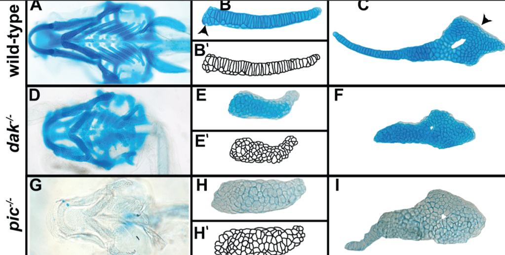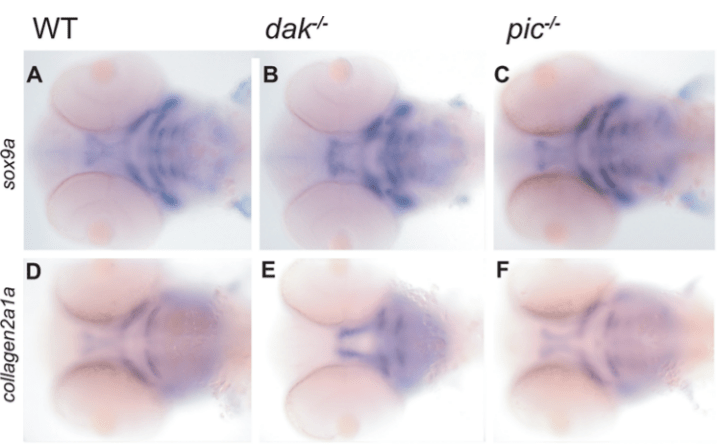 4.1 : Le bleu alcian colore les tissus cartilagineux, plus précisément les GAG qui se trouvent spécifiquement dans la matrice extracellulaire. 4.2 : Le mutant dak-/- possède un tissu cartilagineux bien coloré en bleu (donc présence suffisante de GAG) mais la forme des chondrocytes est altérée. Aucun n’a la forme en parallélépipède qu’ont les chondrocytes du poisson sauvage. Le mutant pic-/- a le même défaut de morphologie cellulaire mais en plus la matrice extracellulaire est très affectée car elle n’est même plus colorée par le bleu alcian, indiquant une diminution importante de sa teneur en GAG. 4.3 : Le mutant dak-/- présente des quantités diminuées des GAG sulfatés qui sont analysés et le mutant pic-/- présente une disparition complète des GAG. Cela confirme ce que l’on avait observé en 4.2. Le mutant pic-/- est nettement plus affecté et ces absences de GAG peuvent expliquer l’absence de coloration au bleu alcian. 4.4 : Sox9 code une protéine impliquée dans le développement des chondroblastes et le collagène 2a1a est un collagène spécifique de la matrice extracellulaire cartilagineuse qui est exprimé assez tôt. Il s’agit de voir si les défauts observés ne viennent pas d’anomalies au cours du développement du tissu. 4.5 : On n’observe pas de différence entre le sauvage et le mutant pic-/-. Le mutant dak-/- présente des modifications dans la disposition du cartilage en développement marqué. Cela suggère que le mutant dak-/- a des défauts d’origine développementale qui se répercutent sur sa matrice extracellulaire et la forme des cellules alors que le mutant pic-/- a un phénotype qui apparait plus tardivement et qui affecte uniquement la matrice extracellulaire et la différenciation finale des cellules.