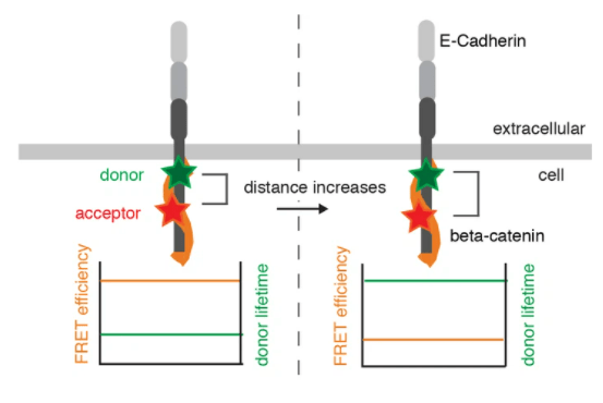 5.1 : Cette technique de transfert d’énergie entre molécules fluorescentes permet de voir en microscopie si deux fluorophores se trouvent à moins de 10 nm l’un de l’autre. Pour ce faire, la longueur d’émission d’un fluorophore A doit pouvoir excité un fluorophore B dont on pourra enregistrer l’émission de photons. 5.2 : On trouve ces 2 molécules dans les jonctions adhérentes type zonula adherens des épithéliums avec des interactions homophiliques extracellulaires entre deux cadhérines et un complexe intracellulaire avec la beta-caténine, la p120-caténine, l’alpha-caténine, la vinculine et des microfilaments d’actine. 5.3 : L’efficacité du FRET baisse si la distance augmente entre les deux flurorophores, c’est-à-dire si le domaine intracellulaire de la E-cadhérine où se trouve le premier fluorophore s’éloigne de la béta-caténine. Cela peut arriver si le complexe se défait ou si il y a une tension sur la E-cadhérine qui la tire vers l’extérieur et déforme le complexe. 5.4 On observe un temps de vie de fluorescence homogène dans les différentes cellules au stade 5 et au début du stade 6 où on observe que des cellules au centre de l’image présentent une légère déformation par rapport aux autres. Au stade 6, cette déformation est accentuée, des cellules sont plus étroites dans une dimension. Ces cellules ont un temps de vie de fluorescence nettement plus élevé que leurs voisines ce qui indique qu’il y a sans doute des tensions aux jonctions intercellulaires accompagnant ces déformations qui éloignent les fluorophores de la E-cadhérine et de la beta-caténine.