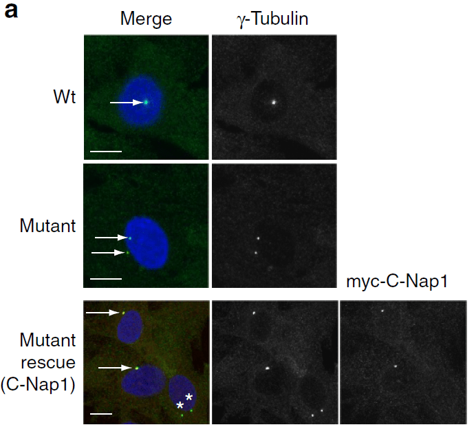 8.1 : La gamma-tubuline permet de repérer le centrosome composé de 2 centrioles. 8.2 : La mutation provoque une augmentation significative de la distance entre les 2 centrioles du centrosome. 8.3 : Il s’agit d’une expérience de sauvetage pour vérifier que le phénotype lié à la mutation est uniquement du à un manque d’expression de C-Nap1. De plus, cela permet d’introduire une forme taguée de la protéine, facilement localisable grâce à un anticorps couramment utilisée (anticorps anti-Myc). On observe que les cellules qui expriment myc-C-Nap1 retrouvent un centrosome normal où les centrioles sont côte à côte. La cellule en bas à droite n’exprimant pas myc-C-Nap1 a toujours ses deux centrioles éloignés. Le sauvetage a bien marché et en plus, on remarque que myc-C-Nap1 est localisé au centrosome et donc agit directement localement. 8.4 : On observe que la cicatrisation de la blessure réalisée sur le tapis cellulaire démarre de manière similaire entre les cellules sauvages et mutantes mais à 15h et à 20h la cicatrisation des cellules mutantes prend du retard sur celle des cellules sauvages. Cela indique un défaut de migration et éventuellement un défaut de prolifération (la cicatrisation est aussi dépendante de ce paramètre).