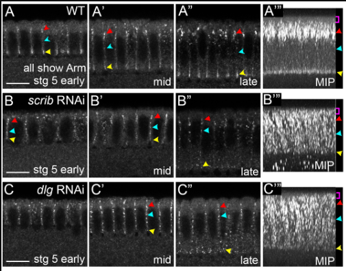 9.1 : La β-caténine est localisée au niveau des jonctions adhérentes et également on peut en déceler dans le cytoplasme et éventuellement dans le noyau si les cellules épithéliales répondent à un ligand Wnt. 9.2 : Au stade précoce, la β-caténine est localisée aux niveaux apical, basal et aussi au niveau latéral (flèche verte). Cette dernière localisation s’amenuise aux stades plus tardifs. La localisation apicale devient plus intense que la localisation basale. 9.3 : Lorsque l’expression de l’une ou l’autre de ces protéines est inhibée, on observe la β-caténine tout le long du flanc des cellules épithéliales que ce soit du côté apical, latéral ou basal. Elle est un peu plus présente du côté apical mais la polarité apico-basale de sa répartition habituelle est globalement perdue. Scrib et Dlg sont donc nécessaires à cette polarité de répartition et donc probablement à la formation de jonctions adhérentes fonctionnelles.