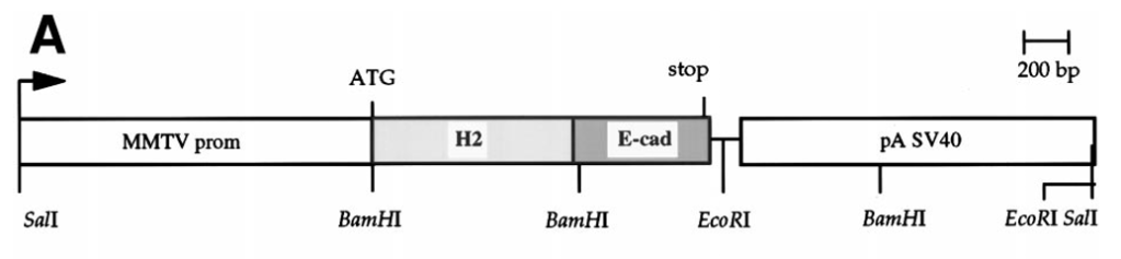 On veut comprendre le rôle du domaine intracellulaire de la E-cadhérine au cours du développement de la glande mammaire. On créé des souris transgéniques qui expriment sous le contrôle d’un promoteur de MMTV (un virus qui exprime ses gènes uniquement dans la glande mammaire) un gène codant une protéine chimérique : le domaine extracellulaire d’une protéine membranaire intervenant dans le système immunitaire (H2) et le domaine transmembranaire et intracellulaire de la E-cadhérine. Source : https://www.sciencedirect.com/science/article/pii/S0012160699995179