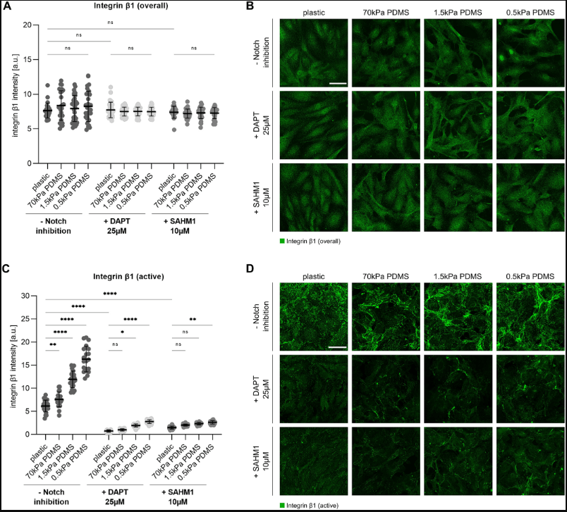 14.1 Le niveau général d’expression de l’intégrine β1 n’est pas affecté par l’inhibition de la voie Notch ni par la modulation de la dureté du substrat sur lequel resposent les cellules. 14.2 Plus le substrat est mou, plus l’intégrine β1 est activée. C’est bien la proportion d’intégrine β1 activée parmi la totalité de l’intégrine β1 qui augmente car la quantité totale d’intégrine β1 ne varie pas d’après la réponse à la question précédente. 14.3 Lorsqu’on inhibe la voie Notch (que ce soit par le DAPT ou par SAHM1) on a une diminution importante de l’activation de l’intégrine β1. L’effet de la dureté du substrat sur l’activation de l’intégrine β1 est conservé mais avec une amplitude bien plus faible. La voie de signalisation Notch joue un effet inside-out sur l’activité de l’intégrine β1.