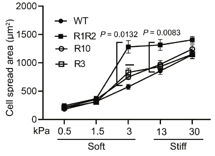15.1 Il s’agit de se débarrasser de la taline endogène et de n’exprimer que les talines produites à partir des vecteurs d’expression, y compris la taline sauvage qui ainsi peut être un bon témoin par rapport aux mutants. 15.2 L’étalement des cellules augmente avec la dureté du substrat de la même manière avec la taline mutée R3 et R10 qu’avec la taline sauvage. En revanche, avec la taline mutée en R1R2, à partir de 3 kPa et des duretés supérieures, les cellules sont plus étalées. Cela démontre que les domaines R1 et/ou R2 de la taline jouent un rôle dans la limitation de l’étalement des cellules sur un substrat dur. 15.3 Dans les cellules avec la taline sauvage, l’inhibition de l’expression de la vinculine aboutit à une petite baisse de l’étalement pour un substrat dur. Dans le cas des cellules avec une taline mutée dans R1 et R2, l’étalement plus important observé par rapport aux cellules avec une taline sauvage est partiellement mais pas complètement aboli quand on inhibe l’expression de la vinculine. Il existe toujours une différence significative entre cellules avec taline normale et taline mutée en absence de vinculine. On en déduit que la vinculine a des effets opposé à la taline sur l’étalement des cellules sur substrat dur et que la taline agit au moins partiellement indépendamment de la vinculine sur l’étalement.