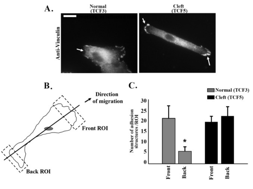 16.1 On constate que la cellule normale est polarisée avec une région présentant des prolongements qui semblent être des lamellipodes (à droite) et une partie sans ces prolongements (à gauche). La cellule du patient est plus allongée, selon un axe précis et symétrique, sans polarité claire le long de cet axe. 16.2 Il y a une répartition asymétrique des points d’adhérence focaux dans les cellules normales (avec plus de points à l’avant) alors que que dans les cellules du patient, il y a une répartition symétrique avec beaucoup de points d’adhérence focaux à l’avant et à l’arrière. 16.3 Les cellules sans asymétrie et avec trop de points d’adhérence focaux vont connaitre sans doute des défauts de migration. Les cellules composant la face proviennent des cellules de crête neurale qui migrent de manière importante et on peut supposer qu’un défaut de leur migration peut causer des malformations telles que le bec de lièvre.