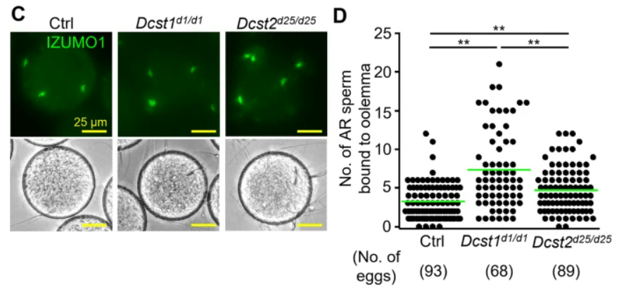 5.1 : Les spzdes sans DCST1 ou sans DCST2 sont capables de s’accrocher aux ovocytes (leur zone pellucide ou leur membrane plasmique, on ne peut pas le distinguer). 5.2 : IZUMO est localisé à la membrane de l’acrosome puis après la réaction acrosomiale (ou acrosomique), à la membrane plasmique. Cette protéine interagit avec JUNO qui se trouve à la membrane plasmique de l’ovocyte et cette interaction est nécessaire à la fusion entre les membranes plasmiques des 2 gamètes. On n’observe pas de différences notables dans l’expression d’IZUMO démontrant que ni DCST1, ni DCST2 ne sont indispensables pour son expression. 5.3 : Le fait de voir IZUMO en immunofluorescence sans perméabilisation veut dire que la réaction acrosomiale a eu lieu car elle est nécessaire pour que IZUMO soit à la membrane plasmique et donc détectable par un anticorps dans ces conditions. On constate que les spzdes mutants n’ont aucun problème notable à réaliser la réaction acrosomiale. Soit ni DCST1, ni DCST2 sont impliqués dans ce processus, soit l’absence de l’un peut être compensé par l’autre. 5.4 : Il y a en moyenne plus de spzdes mutants accrochés à la membrane plasmique de l’ovocyte que de spzdes sauvages. Cela peut vouloir dire que DCST1 et DCST2 diminuent les capacités de fixation des spzdes à la membrane plasmique de l’ovocyte ou alors que DCST1 ou DCST2 sont nécessaires pour l’étape suivante et que le blocage de la polyspermie n’a pas été enclenché permettant à de multiples spermatozoïdes de s’accrocher à la membrane plasmique de l’ovocyte. 5.5 : On observe le marquage Hoechst dans le pronucléus de l’ovocyte mais aussi chez le contrôle dans le pronucléus mâle (flèche). Ce dernier marquage ne correspond pas au noyau d’un spzde resté à l’extérieur puisque le Hoechst n’est plus présent lors de la fécondation et donc l’ADN du spzde doit être dans l’ovocyte pour pouvoir être marqué. On n’observe pas de marquage autre que celui du noyau femelle dans les ovocytes fécondés avec les spzdes mutants. On en déduit qu’il n’y a pas eu de fusion entre les spzdes mutants et les ovocytes. 5.6 : Ces données nous permettent de confirmer que DCST1 ou DCST2 sont nécessaires pour la fusion entre spzdes et ovocytes.