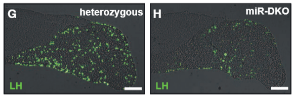 **6.1 Sachant que les souris femelles miR-DKO ne donnent pas de souriceaux malgré des accouplements avec des mâles fertiles (les souris hétérozygotes donnent un nombre normal de souriceaux), analysez et interprétez les résultats.