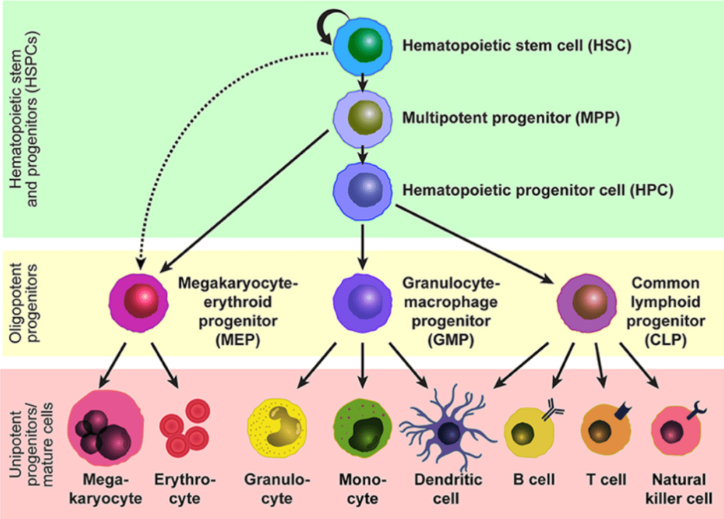 Les cellules souches hématopoïétiques (HSC) soutiennent la production de sang tout au long de la vie et sont les unités fonctionnelles lors de la greffe de moelle osseuse. L’énorme quantité de cellules sanguines produites chaque jour chez l’homme (environ un milliard) repose sur un nombre suprenamment petit de HSC (quelques dizaines de milliers à quelques centaines de milliers chez l’Homme selon diverses estimations). Les HSC sont capables de s’auto-renouveler pour maintenir leur pool tout en produisant toutes les cellules sanguines matures par différenciation en progéniteurs multipotents (MPP) et en cellules progénitrices hématopoïétiques (HPC) avec des potentiels de différenciation plus limités. La population des HSC est fonctionnellement hétérogène en termes : (i) de cinétique du cycle cellulaire (avec certaines HSC se divisant seulement 5 fois durant les 2 ans de vie d’une souris (Cabezas et al., 2017)), (ii) de capacité d’auto-renouvellement et (iii) de potentiel de différenciation, et ces sous-types peuvent être distingués par des marqueurs tels que CD229 et le facteur von Willebrand. Toutes ces populations sont cependant multipotentes mais restreintes en potentialité aux lignées hématopoïétiques : par exemple des HSC transplantées dans un coeur ne peuvent pas générer de nouveaux cardiomyocytes (Murry et al., 2004).