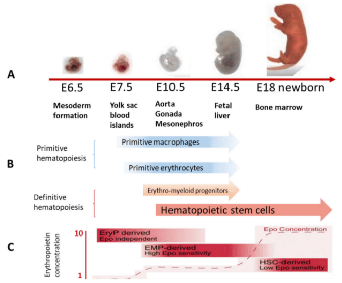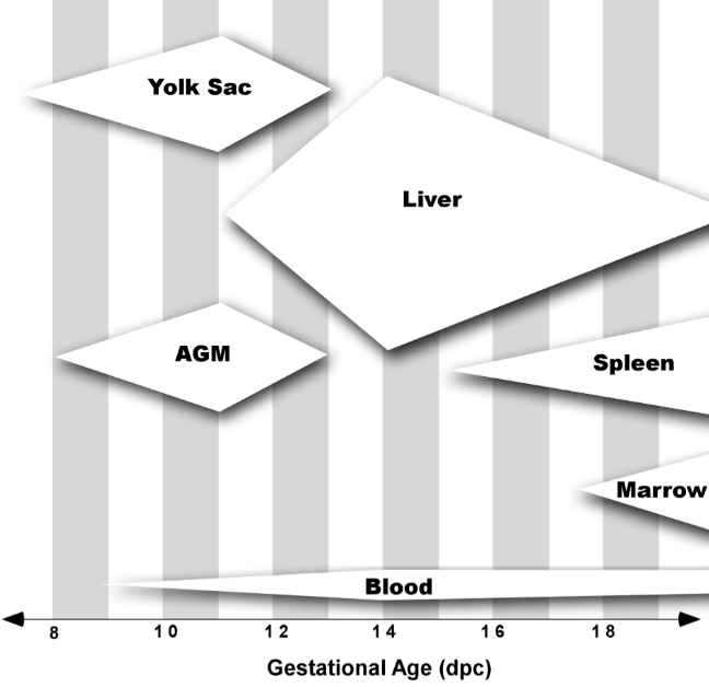 L’hématopoïèse embryonnaire chez les Mammifères se déroule à différents endroits et se produit en trois étapes successives (« vagues »). Les deux premières vagues ont lieu dans le sac vitellin extra-embryonnaire (à partir de 16 jours après la fécondation chez l’Homme et E7,5 chez la souris), avec la formation de populations hématopoïétiques transitionnelles (hématopoïèse mégaloblastique). Certaines cellules apparentées aux macrophages formées lors de cette vague sont maintenues chez l’adulte dans des tissus qu’elles colonisent lors du développement embryonnaire (cellules microgliales dans le système nerveux central, cellules de Langerhans dans la peau et cellules de Kupffer dans le foie) (Mirshekar et al., 2014).