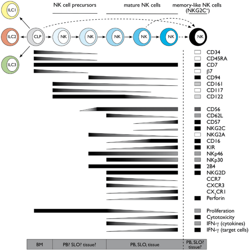 Les cellules NK se développent à partir de cellules progénitrices lymphoïdes communes (CLP) dérivées de cellules souches hématopoïétiques CD34+. Les CLP sont les précurseurs communs des NK, des lymphocytes T et B et d’autres cellules lymphoïdes. Elles expriment différents marqueurs, notamment CD38, CD7, CD10, CD127 et CD122. L’expression de CD122 (IL-2Rβ/IL-15R) marque la détermination des CLP en cellules NK. Cette détermination dépend de l’expression de Eomesodermine et de T-bet (Daussy et al., 2014) ainsi que de Id2 qui réprime l’action des protéines E, notamment Socs3, E2A, E2-2 et HEB (en se dimérisant avec eux et en les empêchant de se fixer sur des séquences de type boîte E (CANNTG) sur l’ADN). Ces protéines auraient déterminé les cellules en lymphocytes B ou T. Id2 stimule aussi l’expression des récepteurs à l’IL-15 activant une voie de signalisation essentielle pour la survie des NK (Delconte et al., 2016). Cette voie maintient l’expression de la protéine anti-apoptotique MCL1 et inhibe l’expression de la protéine apoptotique BIM (Huntington et al., 2007).