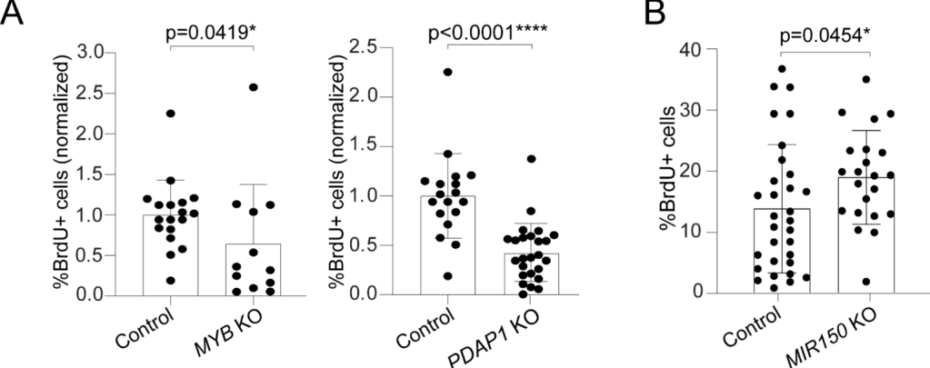 Lors de l’activation des lymphocytes T via le TCR des modifications importantes de l’expression des gènes ont lieu. Par exemple, l’expression du microARN miR-125b est diminuée alors qu’il a un rôle dans le maintien des lymphocytes T dans un état naïf (Rossi et al., 2011). Le microARN miR-150 voit son expression également diminuée en relation avec une baisse d’expression des facteurs de transcription RFX qui sont nécessaires pour son expression (Chiricella et al., 2022). Les cibles de ce microARN, MYB (un facteur de transcription) et PDAP1 (une protéine se liant à des ARN) voient logiquement leur expression augmenter lorsque les lymphocytes T sont activés. L’expression de MYB est nécessaire à la prolifération des lymphocytes T. L’expression de miR-150 est largement diminuée dans les lymphomes (Ito et al., 2014).
