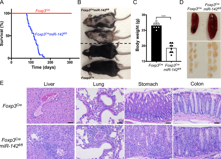 (A) Courbes de survie de Kaplan-Meier des souris Foxp3Cre et Foxp3Cre;miR-142fl/fl (B) Photographie de souris femelles Foxp3Cre (2 souris en bas) et Foxp3Cre;miR-142fl/fl (2 souris en haut) âgées de 14 semaines. Les souris Foxp3Cre;miR-142fl/fl sont plus petites et ont une dermatite sévère (C) Comparaison du poids corporel des souris Foxp3Cre et Foxp3Cre;miR-142fl/fl mâles âgées de 8 à 10 semaines . (D) Images représentatives de la rate et des ganglions lymphatiques périphériques de souris Foxp3Cre (à gauche) et Foxp3Cre;miR-142fl/fl (à droite). (E) Coloration hématoxyline-éosine de coupes de tissus du foie, des poumons, de l’estomac et du côlon de souris Foxp3Cre et Foxp3Cre;miR-142fl/fl. On observe une accumulation massive de leucocytes dans les tissus Foxp3Cre;miR-142fl/fl. Barre d’échelle = 50 μm. Source : https://journals.plos.org/plosbiology/article?id=10.1371/journal.pbio.3001552