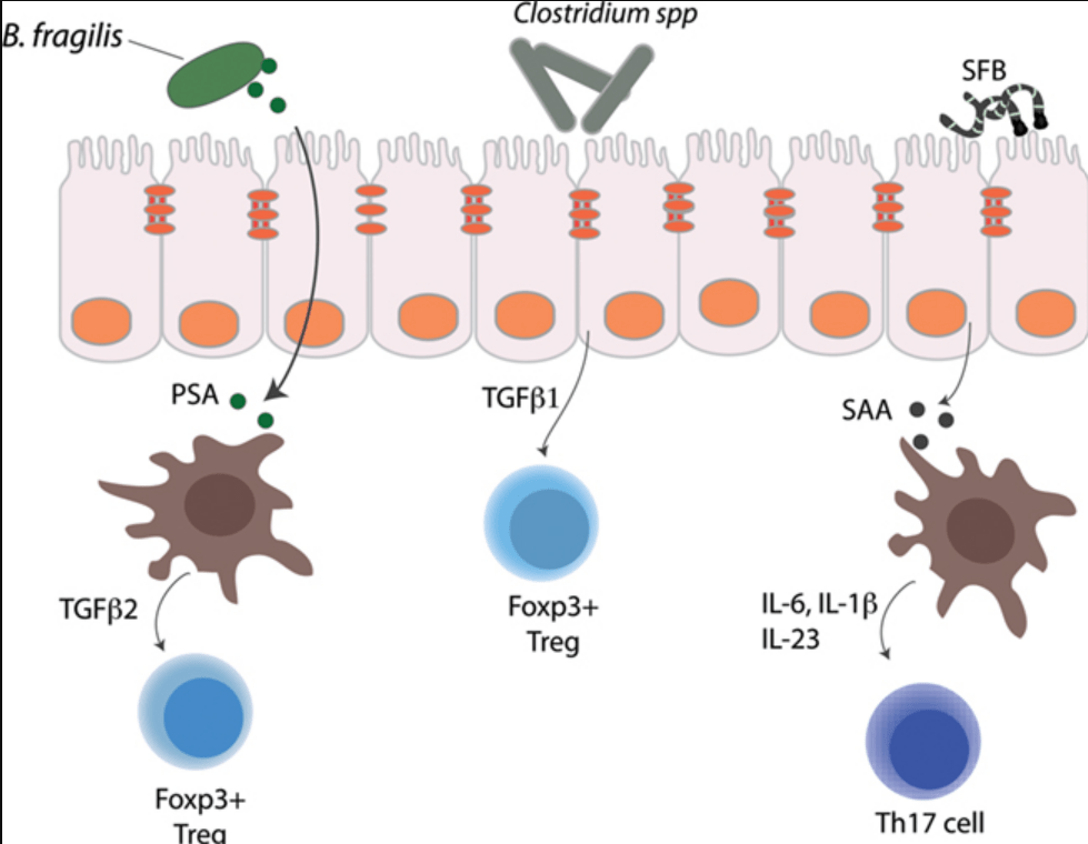Le développement des lymphocytes T à proximité de l’intestin peut être influencé par le microbiote intestinal (Smith et Garrett, 2011). Bacteroides fragilis est un symbiote Gram négatif qui habite le tractus intestinal inférieur et colonise environ la moitié des humains. La monocolonisation des souris sans bactéries (GF) avec B. fragilis induit une expansion globale des lymphocytes T CD4 et une augmentation du nombre de cellules Th1 à des niveaux similaires à ceux des souris élevées normalement. L’effet de B. fragilis est entièrement dépendant d’un polysaccharide capsulaire zwitterionique, le polysaccharide A (PSA) (Mazmanian et al., 2005). L’exposition au PSA in vivo et in vitro est suffisante pour induire l’expansion des populations Th1 et la production de cytokines et les souris GF colonisées par B. fragilis dépourvues de PSA ne réussissent pas à corriger leur déséquilibre Th1/Th2. Les acides gras à courte chaîne telles l’acétate, le butyrate et le propionate produits par le métabolisme des microbiotes influence également le développement du système immunitaire intestinal.