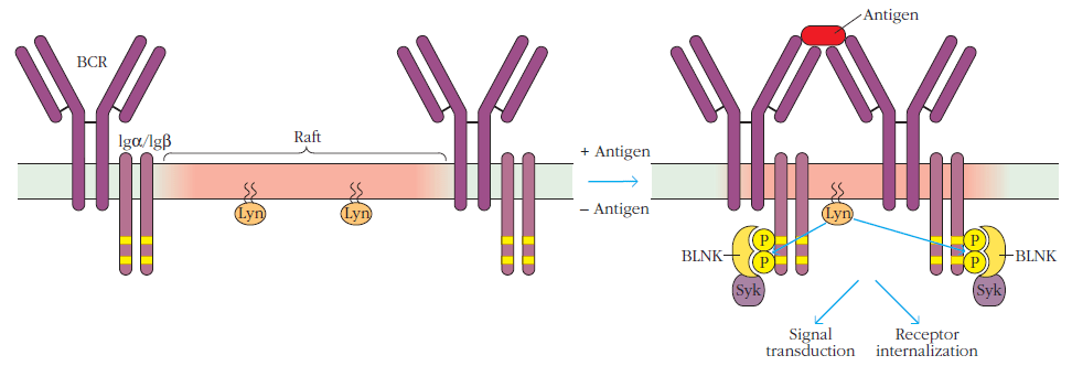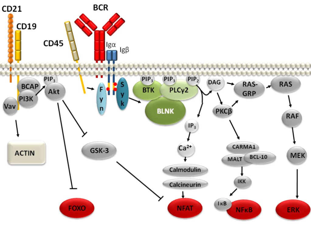 La liaison d’un antigène à un récepteur BCR active une cascade de signalisation à plusieurs branches qui aboutit à des changements importants dans le métabolisme cellulaire, l’organisation du cytosquelette, la migration et l’adhésion, la progression du cycle cellulaire et, finalement, cela aboutit à la différenciation en une cellule effectrice sécrétant des anticorps et un lymphocyte B mémoire (Treanor et al., 2012).