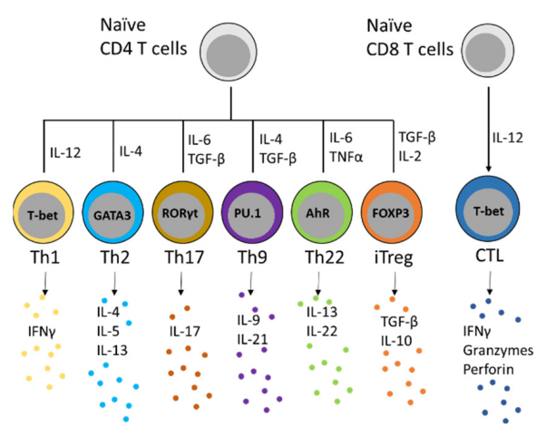 La différenciation dans chaque sous-ensemble T auxiliaire est principalement contrôlée par les cytokines présentes dans leur microenvironnement. Ces sous-ensembles d’auxiliaires CD4+ sont les suivants : Th1 sous l’influence de IL-12 ; Th2 sous l’influence de IL-4 ; Th9 sous l’influence de IL-4 et de TGF-β ; Th17 sous l’influence de IL-6 et de TGF-β ; Th22 sous l’influence de IL-6 et de IL-23 ; et Treg sous l’influence de TGF‐β et de IL‐2.