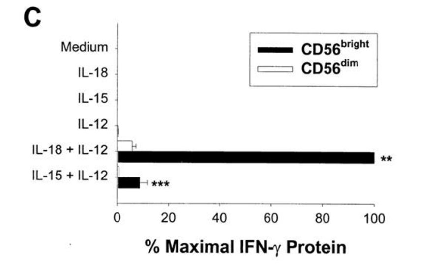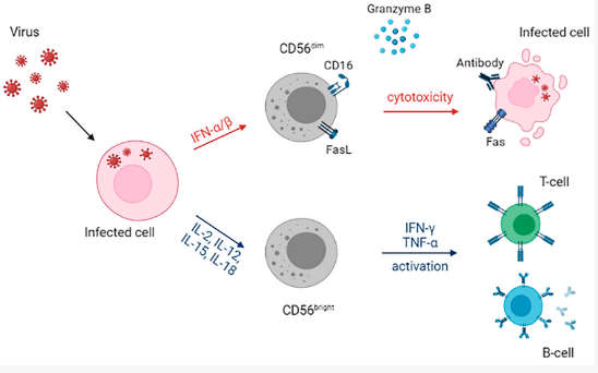 Lors des infections virales, l’activation des cellules NK cytotoxiques et sécrétoires est stimulée par des cytokines spécifiques dont l’expression est activée lors de la réplication virale. Par exemple, les interférons de type I (IFN-α/β), sécrétés par les cellules infectées, induisent la cytotoxicité des cellules NK dites à CD56 faible; l’expression d’IL-12 (interleukine-12) stimule la sécrétion d’IFN-γ (interféron-γ) par les cellules NK dites à CD56 fort mais il faut la présence concommitante d’IL-15 ou d’IL-18 (Fehninger et al., 1999).