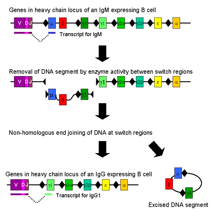 Les lymphocytes B sont responsables de l’immunité humorale et de la production des anticorps. Ils présentent à leur membrane plasmique des récepteurs BCR spécifiques d’un antigène. Chaque lymphocyte B, produit dans la moelle osseuse, est spécifique à un antigène. La diversité énorme de ce répertoire à l’échelle d’un individu ne peut être codé directement par le génome mais résulte de recombinaisons génétiques dans chaque clone de lymphocytes B qui fait jouer une combinaison d’éléments génétiques. Ces recombinaisons sont qualifiées de somatiques pour les distinguer des recombinaisons dans les cellules germinales lors de la méiose.