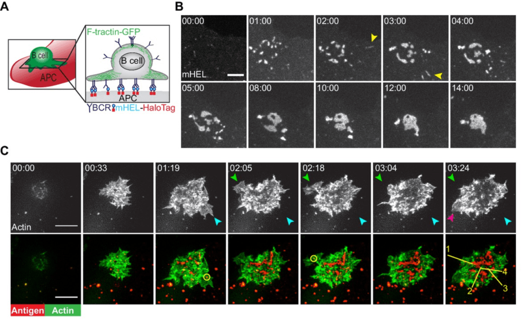 L’interaction du récepteur des cellules B (BCR) avec l’antigène apparenté présenté par une cellule présentatrice d’antigène (CPA) déclenche des changements importants dans la physiologie des cellules B qui favorisent leur activation, la formation de la synapse immunitaire (SI) et les fonctions effectrices des cellules B (Harwood et Batista, 2011). La SI permet l’échange d’informations entre les deux cellules par le biais d’événements exocytaires et endocytaires étroitement régulés (Griffiths et al., 2010). La signalisation et le trafic au niveau de la SI nécessitent des réarrangements profonds des microfilaments d’actine et des microtubules. L’actine contrôle l’organisation des microclusters contenant des récepteurs d’antigènes ce qui permet la coordination entre le trafic et la signalisation et aide en outre à générer les forces mécaniques qui dépendent de la myosine II (Treanor et al., 2011; Kumari et al., 2019; Bolger-Munro et al., 2019).