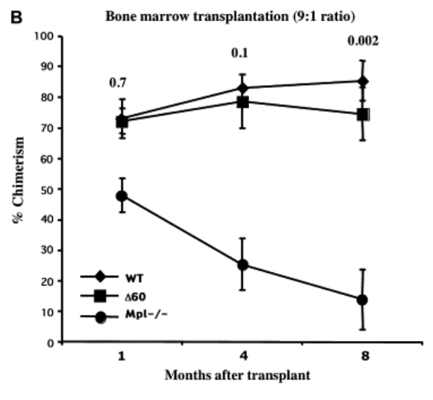 Mpl est dépourvue de toute activité kinase et recrute en présence de thrombopoïétine la kinase Jak2 pour activer plusieurs cascades intracellulaires (voies Mapk, Akt et Stat) (Bersenev et al., 2008). L’inactivation génétique de Mpl (Kimura et al., 1998), Jak2 (Akada et al., 2014) et Stat5 (Wang et al., 2009) entraîne une altération de l’homéostasie des HSC et une défaillance progressive de l’hématopoïèse.