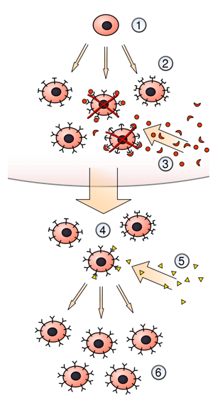 En présence d’antigènes et suffisamment stimulés par d’autres signaux, les lymphocytes B sont activés, prolifèrent et donnent naissance à des plasmocytes producteurs d’anticorps et à des lymphocytes B mémoire.