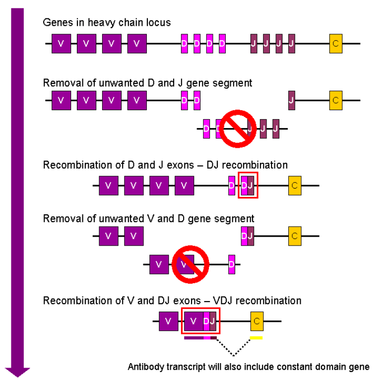 Les séquences codant le segment variable (V), le segment de diversité (D) et le segment de jonction (J) au sein de la région variable des anticorps sont représentées en de multiples exemplaires dans le génome et des réarrangements génomiques permettent de former une combinaison unique à chaque clone de lymphocyte au cours de leur maturation.