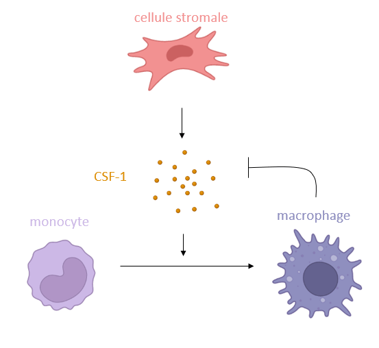 Le contrôle homéostatique du développement des monocytes/macrophages est principalement influencé par le CSF-1 (également connu sous le nom de M-CSF), produit par les cellules stromales dans les tissus. Les macrophages matures expriment à leur tour un excès de récepteurs du CSF-1 (CSF-1R) et éliminent le CSF-1 circulant, permettant une boucle de rétroaction qui cause d’une diminution de la prolifération des monocytes (Bartocci et al., 1987).
