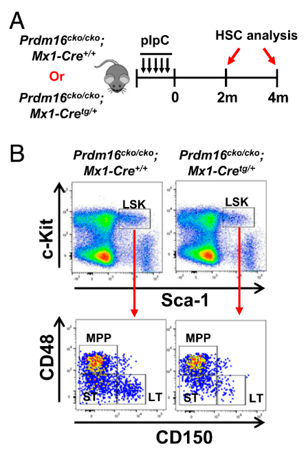 Si trop de ces HSC sortent de quiescence, leur population diminue après une phase d’expansion initiale car de la différenciation précoce est induite. Des études d’ablation génique chez la souris ont montré que les inhibiteurs du cycle cellulaire, en particulier les inhibiteurs des CDK, à savoir p21, p27 et p57, sont essentiels au maintien des HSC adultes (Cheng et al., 2000; Zou et al., 2011). La kinase dépendante des cyclines CDK6 est également impliquée : les HSC en quiescence profonde n’expriment pas CDK6, contrairement aux HSC capables de se remettre à proliférer plus rapidement lors d’une stimulation mitogène. L’expression forcée de CDK6 dans les HSC à quiescence profonde accélère leur sortie de quiescence (Laurenti et al., 2015). Le facteur de transcription Prdm16 a aussi été impliqué dans ce contrôle car sa perte dans les HSC adultes entraîne une sortie de quiescence et une perte progressive des cellules au fil du temps (Gumundsson et al., 2020).