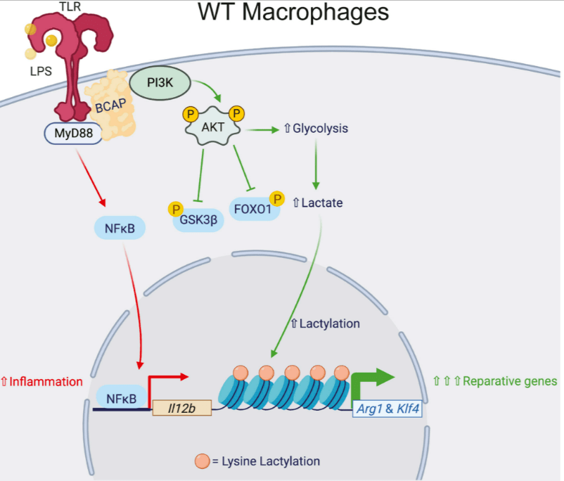 Les macrophages expriment un ensemble diversifié de récepteurs de type PRR (pour Pattern Recognition Receptors) qui reconnaissent des molécules « étrangères » (comme le LPS (LipoPolySaccharides) de la paroi des bactéries Gram-) qui leur permettent de déclencher une réponse inflammatoire appropriée (Fitzgerald et al., 2020). La stimulation de ces PRR, tels que les récepteurs de type Toll (TLR), conduit à l’activation des macrophages et à la production de cytokines pro-inflammatoires dépendantes de NF-κB et AP1 comme le TNF-α, l’IL-6 et l’IL-12.