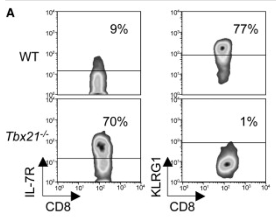 Suite à l’expansion puis à la fin des réponses des lymphocytes T, un pool élargi de cellules mémoires est capable d’initier des réponses puissantes à une infection secondaire grâce à une accessibilité accrue à la chromatine, à une production rapide de cytokines et à un potentiel prolifératif (Mueller et al., 2013). Les populations de lymphocytes T CD8+ mémoire se reconnaissent rapidement lors de l’expansion clonale à la suite de l’activation du TCR car elles expriment fortement le récepteur à l’IL-7 (CD127) et faiblement KLRG1. C’est l’inverse des lymphocytes T CD8+ qui vont mourir après la fin de la réponse primaire et qui dépendent d’IL-15 ce qui est insuffisant pour leur survie à long terme (Kaech et al., 2003). Le choix entre lymphocytes T mémoire ou « éphémères » dépend de la quantité d’IL-12 reçue durant leur développement ce qui se traduit par une expression plus ou moins forte du facteur de transcription T-bet , codé par le gène Tbx21 (fortement exprimé dans les lymphocytes T éphémères et faiblement exprimé dans les lymphocytes T mémoire) (Joshi et al., 2007).