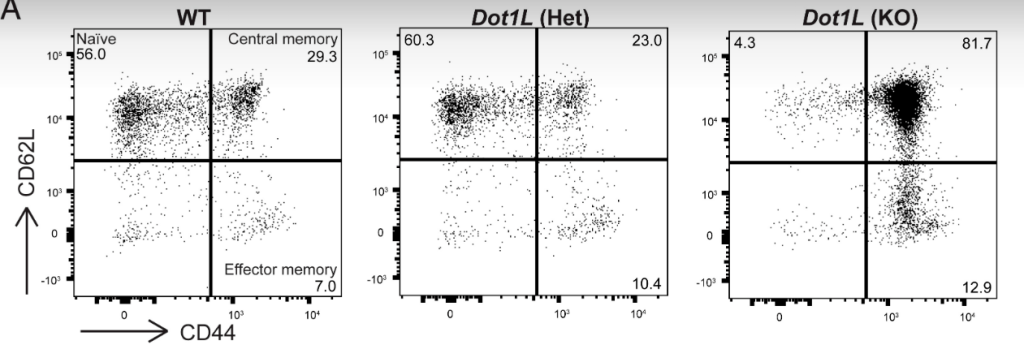 A l’inverse, des facteurs contrôlant la chromatine inhibent cette différenciation en lymphocytes T mémoire pour ne pas qu’elle se fasse trop précocement, avant la rencontre avec l’antigène. L’histone méthyltransférase DOT1L qui permet la triple méthylation de H3K79 (une marque épigénétique d’activation de la transcription) est nécessaire à ce contrôle (Kwesi-Maliepaard et al., 2020).