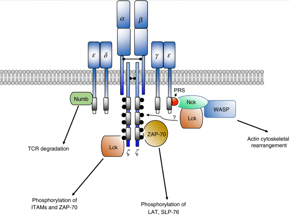 Les TCR sont composés de sous-unités αβ présentant des domaines variables de type immunoglobuline et sont associés au complexe CD3 formé par les sous-unités γ, δ, ε et ζ.