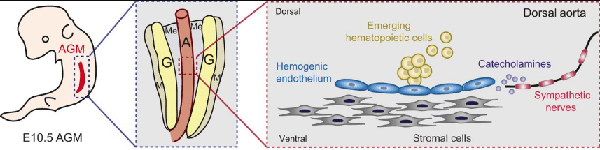 Dans l’aorte dorsale, la niche où sont produites les HSC est mise en place sous le contrôle des signaux BMP produits par le mésenchyme sous-aortique. Une population de cellules endothéliales de l’aorte dorsale dérivant des somites (endotome) et exprimant le gène Meox1 produit également des signaux nécessaires à la genèse de cette niche (Nguyen et al., 2014). La région hématopoïétique est néanmoins restreinte à la moitié ventrale de l’aorte dorsale par la présence de Noggin (un inhibiteur de BMP) qui est produit par les somites en position dorsale par rapport à l’aorte. Les catécholamines (probablement la noradrénaline) produites par les neurones sympathiques qui se trouvent à proximité sont également importantes pour la formation et le maintien de la niche des HSC (Fitch et al., 2012).