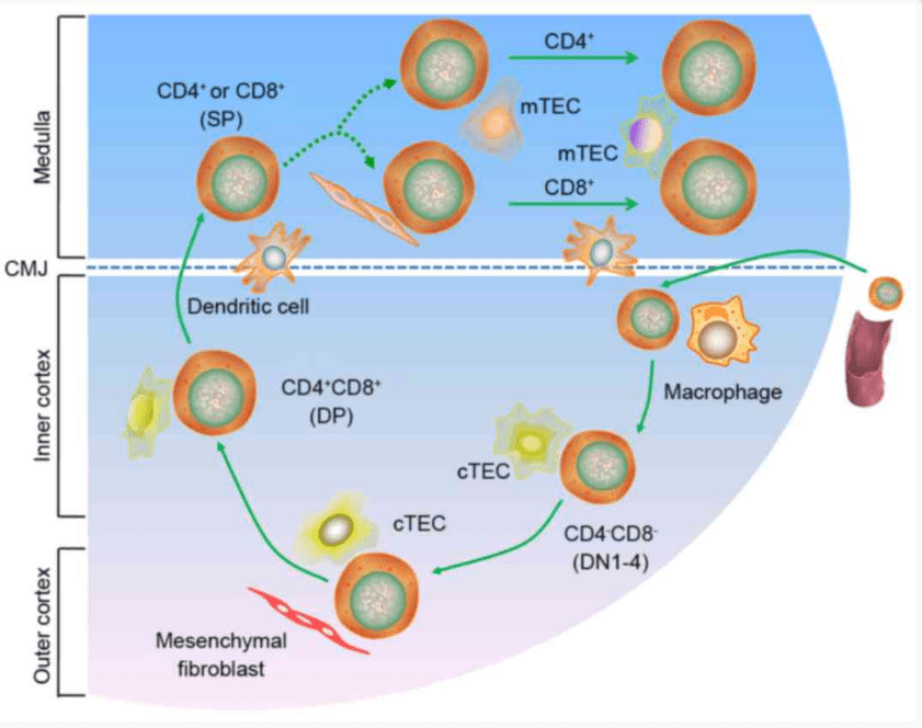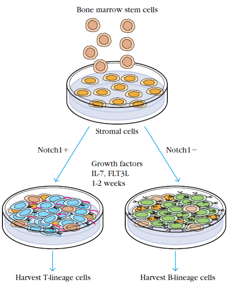 Tous les lymphocytes (B et T) naissent à partir d’un progéniteur lymphoïde commun dans la moelle osseuse. À ce stade, la cellule est multipotente et n’a pas encore acquis de caractéristiques propres aux cellules B ou T. Contrairement aux lymphocytes B, les lymphocytes T ne terminent pas leur maturation dans la moelle osseuse mais se déplacent via la circulation sanguine dans le thymus où ils trouvent un microenvironnement adéquat (notamment le ligand qui active la voie Notch nécessaire à la différenciation en lymphocyte T). Le thymus est ainsi considéré comme un organe lymphoïde primaire, tout comme la moelle osseuse. Si on fait artificiellement exprimé le ligand de la voie Notch dans des cellules stromales de moelle osseuse, on peut obtenir des lymphocytes T au détriment des lymphocytes B, de même si on exprime dans le progéniteur myéloïde commun une forme constitutivement activée de Notch. Des cytokines jouent un rôle d’accompagnement, notamment l’interleukine-7 (IL-7), sécrétée par le stroma thymique, qui soutient la prolifération et la survie des précurseurs T au cours de leur maturation.