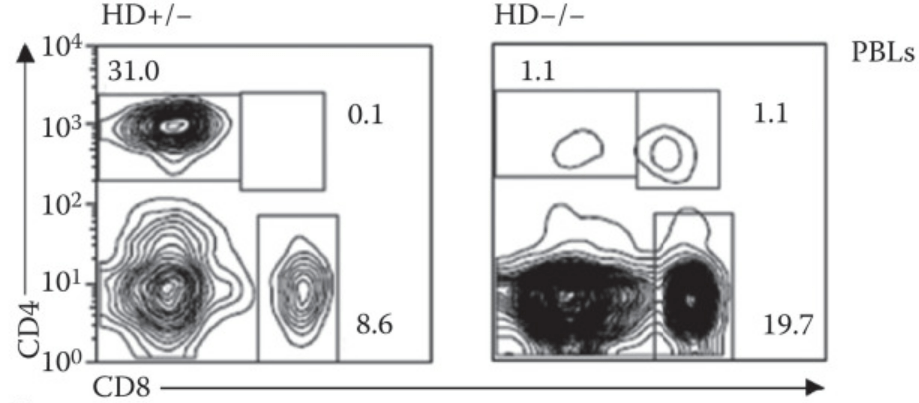 Le thymus est nécessaire au bon développement des lymphocytes T comme le montre l’exemple des souris nude. Il s’agit d’une lignée comportant une délétion du gène Foxn1 qui aboutit à un thymus très malformé ou absent. Les souris ne présentent également presque pas de poils, ce qui explique leur nom. Elles n’ont pas de lymphocytes T et donc ne peuvent rejeter des greffes. Elles sont donc utilisées comme modèle pour des greffes de cellules humaines, notamment tumorales et le test de leur capacité à proliférer et à former des métastases.