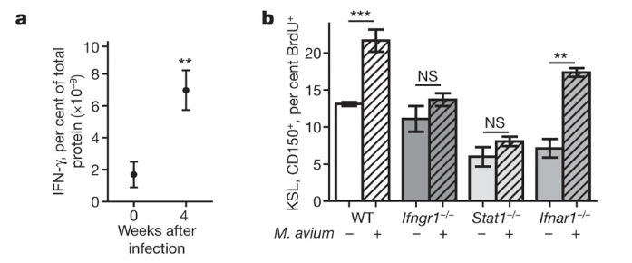 Les HSC sont sensibles à la situation immunitaire générale de l’individu et des infections bactériennes ou virales peuvent changer leur comportement, le plus souvent en stimulant leurs divisions, ce qui stimule la production de progéniteurs puis de cellules du système immunitaire qui pourront combattre l’infection. Cet effet est médié par exemple par l’IFN-γ (Baldridge et al., 2010).