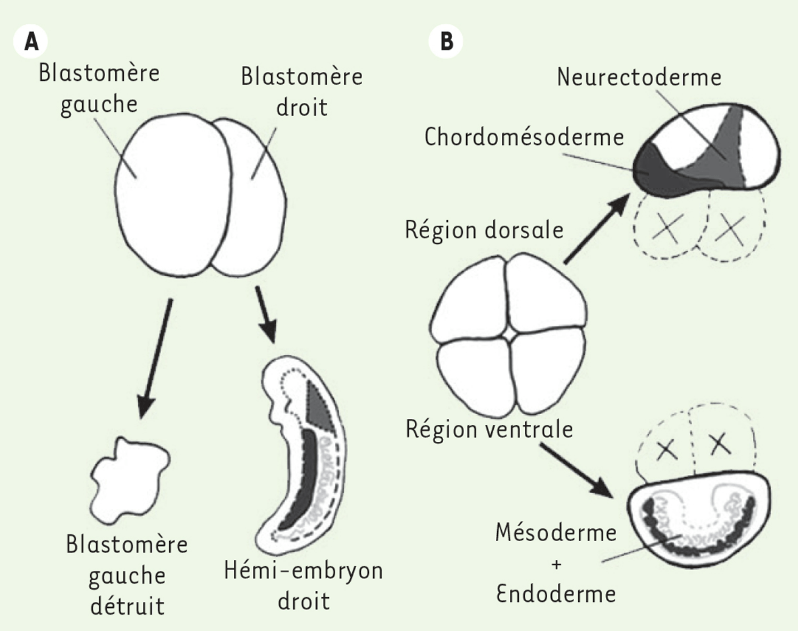 Dans les modalités du développement, la discussion a beaucoup tourné de la fin du XIXème siècle jusqu’à la fin du XXème siècle sur l’opposition entre le développement mosaïque et le développement à régulation. Sur la base des premières observations sur divers modèles, le développement était généralement considéré comme mosaïque avec des cellules qui très tôt ne peuvent changer de destinée. C’était par exemple les conclusions de Wilhelm Roux (1850-1924) à la suite de la dissociation de deux blastomères de grenouille avec un clou brûlé qui avait observé un développement partiel de chaque blastomère. Laurent Chabry (1855-1894) est arrivé à la même conclusion avec l’étude des ascidies.