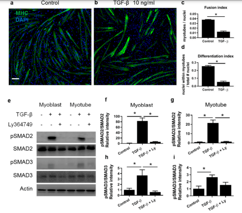 C’est SMAD3, et non SMAD2, qui médie cette inhibition par le TGF-β de la différenciation des ostéoblastes et des myoblastes. Dans ce dernier cas, Smad3 interagit physiquement avec MyoD et perturbe sa liaison à l’ADN, réduisant ainsi l’expression génique spécifique au muscle. Dans l’inhibition de la différenciation ostéoblastique médiée par le TGF-β, SMAD3 réprime la fonction de CBFA1 sans perturber sa liaison à l’ADN.
